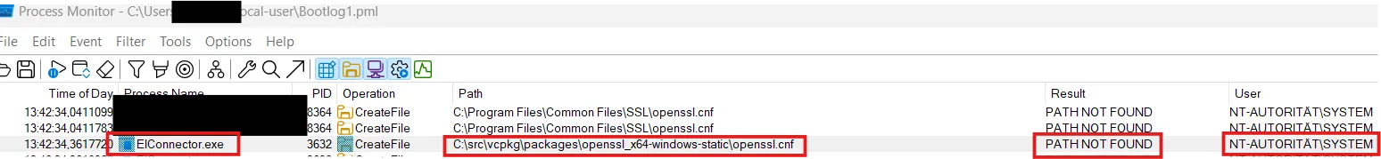 An attacker with local access can create the directory structure C:\src\vcpkg\packages\openssl_x64-windows-static\ and place a malicious openssl.cnf file along with a payload DLL. When the ElConnector service restarts or initializes OpenSSL, it loads the malicious configuration, which in turn loads the attacker’s DLL into the SYSTEM process, achieving privilege escalation.
