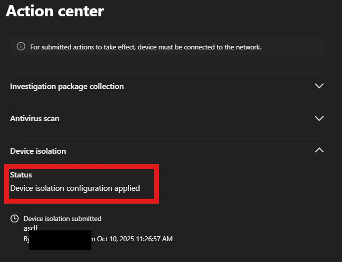 3. Isolation bypassed: The result is an unisolated device that is reported as ‘isolated’ in the Microsoft Defender Portal.