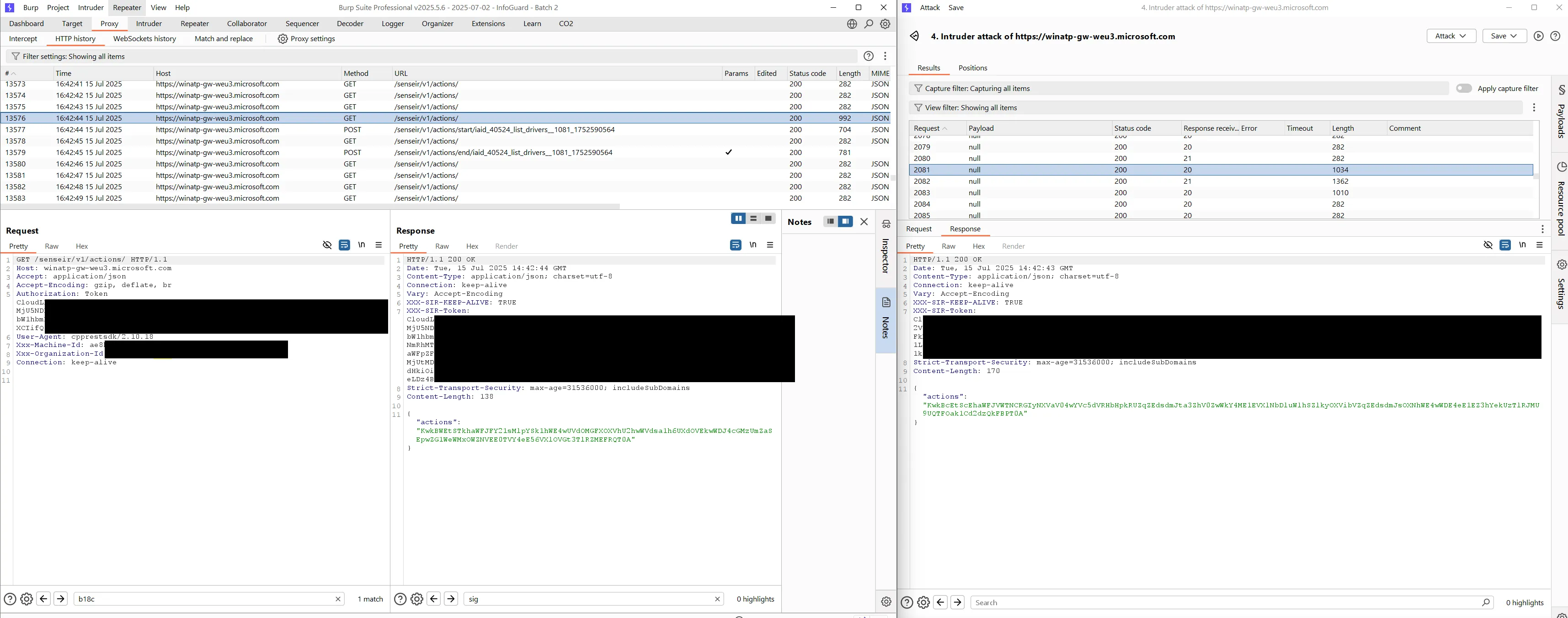 can send valid requests to this URL. These values can be read by low-privileged users on the system. Once the backend sends the command in a response, it will not send it again to subsequent requests. The following two screenshots show the Burp proxy on the left side and an Intruder window on the right that continiously makes requests to /edr/commands/cnc