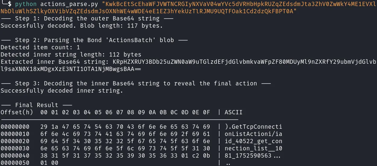 These actions are encoded using Microsoft Bond. To get an idea of their contents, I used a LLM to write a decoder that could decode the data as much as possible without additional metadata:
